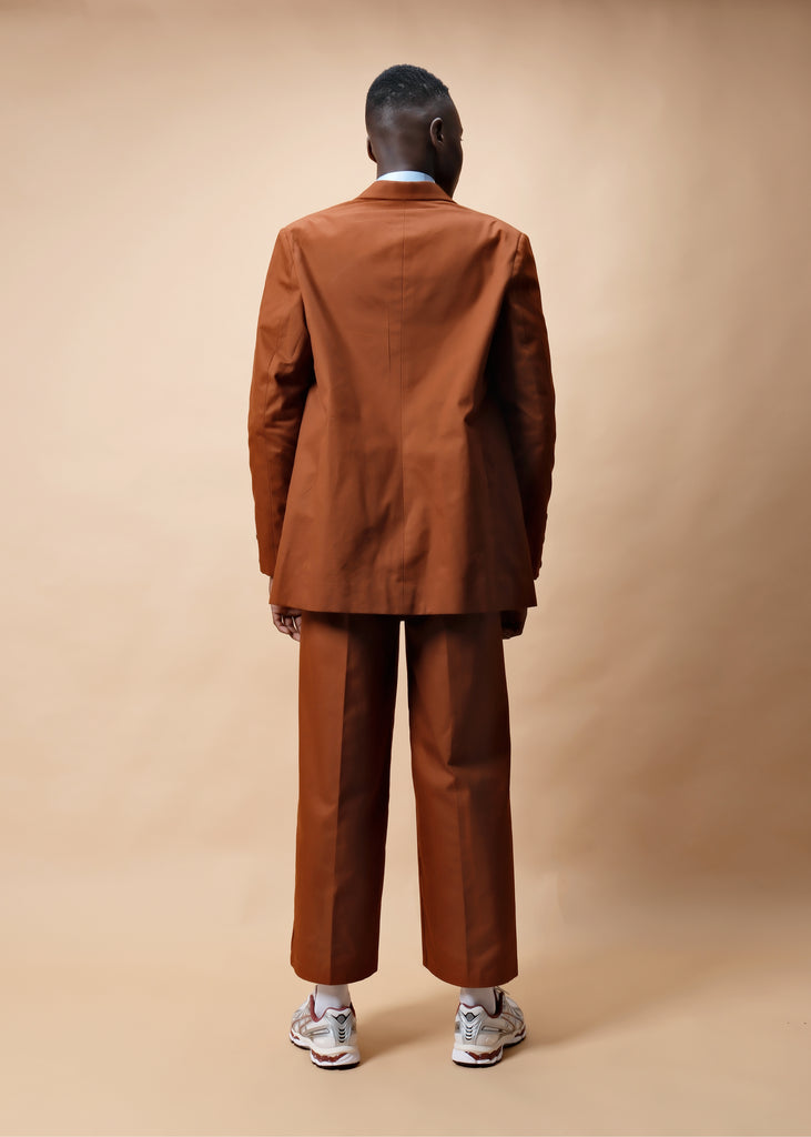 The Paje Suit combines timeless tailoring with contemporary ease. Crafted from sturdy bull denim in a warm rust tone, this piece delivers understated sophistication with practical durability. The loose fit provides comfortable movement without sacrificing structure, while the double-breasted front adds classic depth and visual interest. Perfect for layering or wearing as a statement piece, this cotton suit transitions effortlessly from casual to refined occasions.